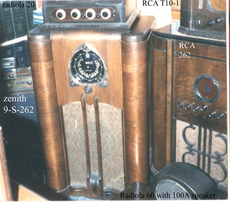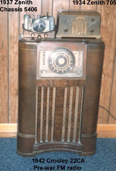 Zenith model 705. The large console is a 1942 Crosley Pre-War FM radio model 22-CA which